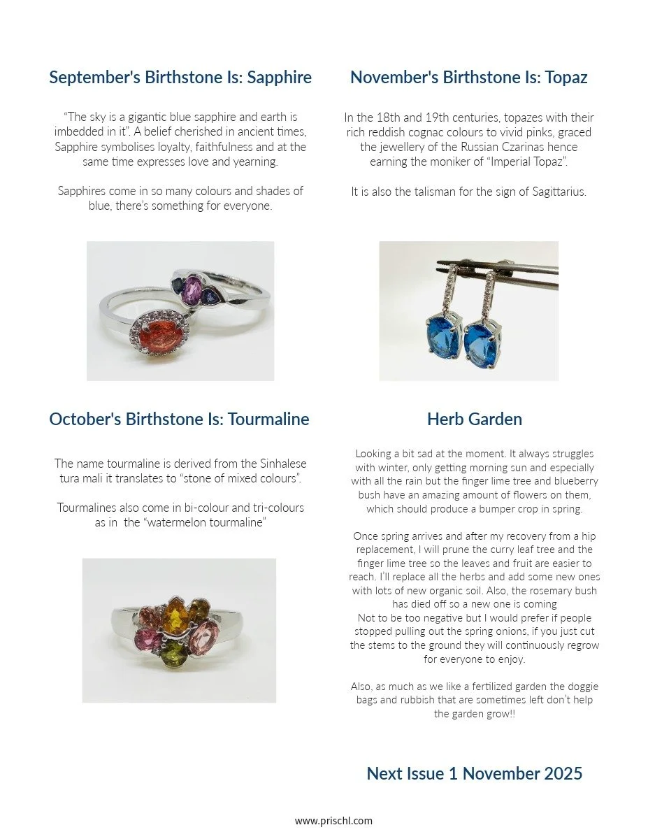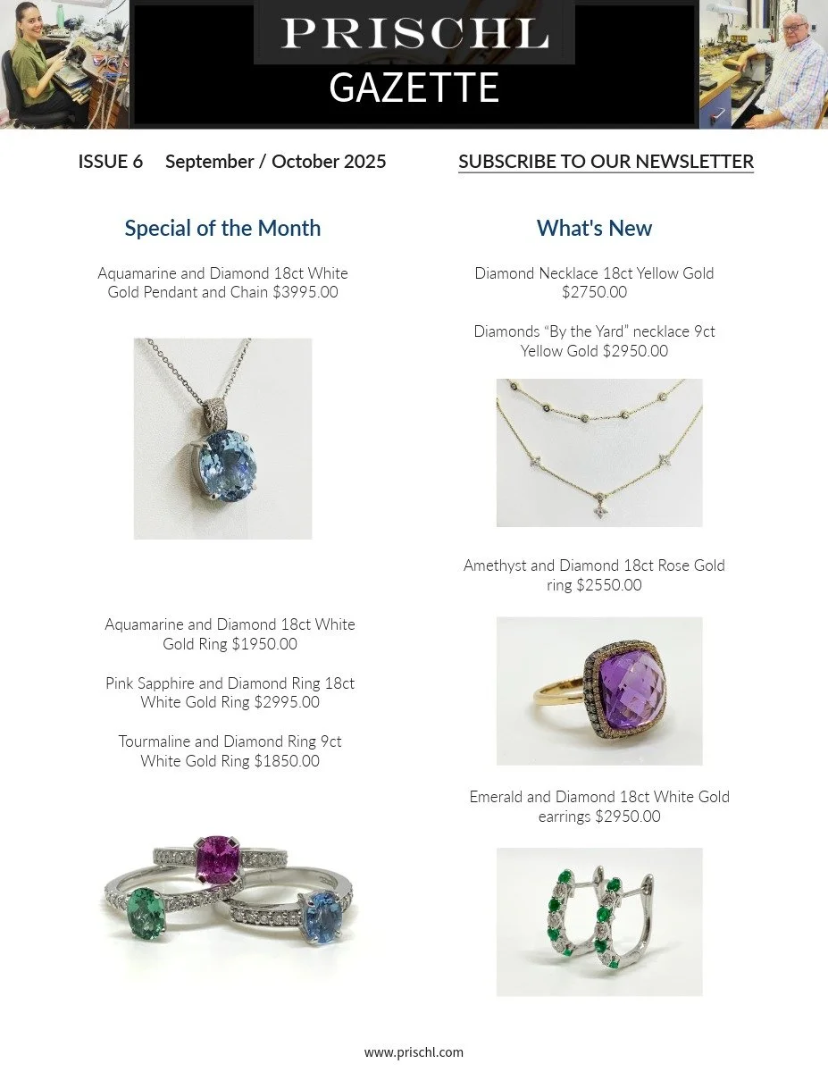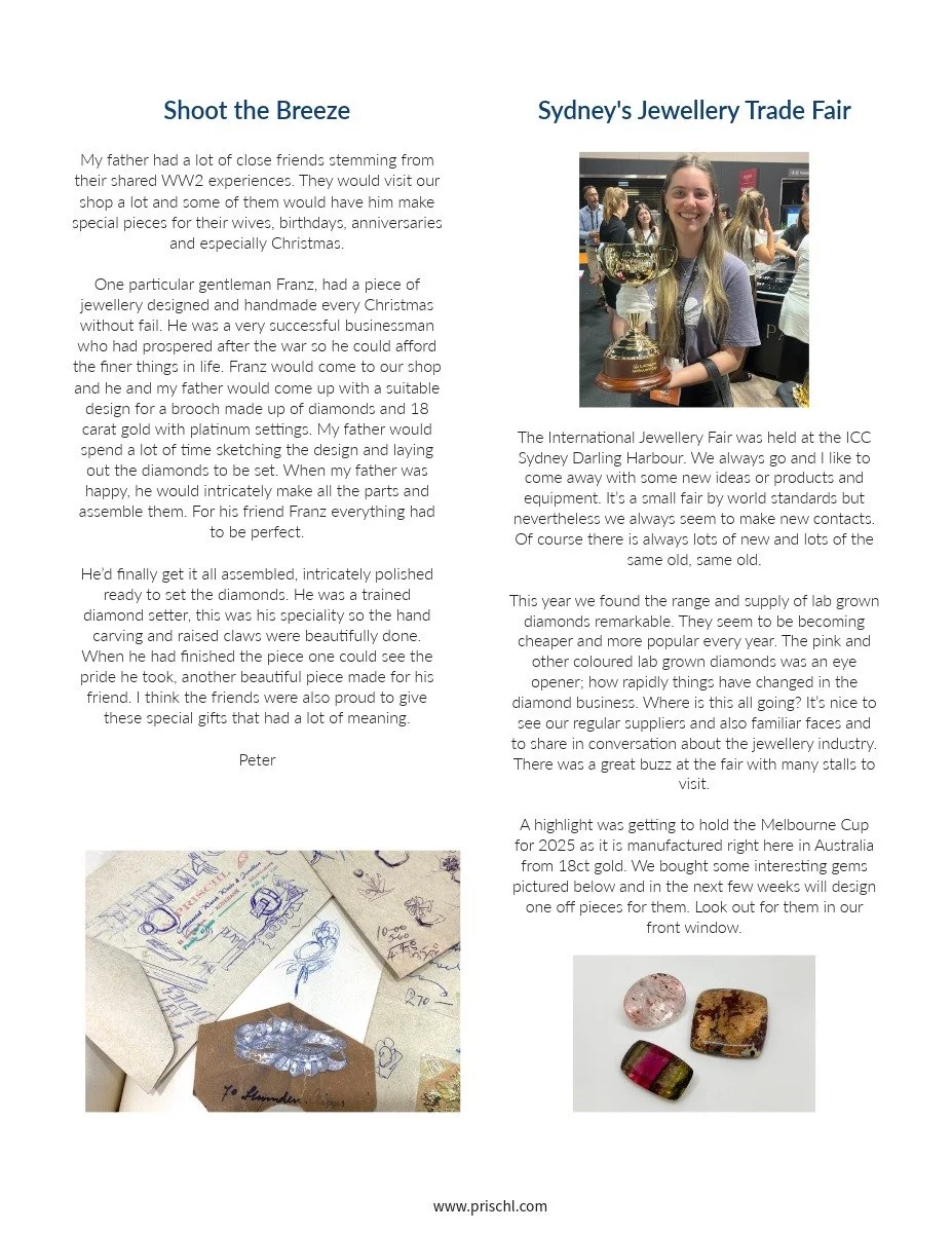 Welcome to our September & October newsletter. This month we feature some stunning new bespoke jewellery designs including a beautiful amethyst and diamond ring, and emerald and diamond earrings. We also Shoot the Breeze with Peter and Izabella, visit Sydney’s Jewellery Trade Fair, and look at upcoming birthstones of Sapphire, Tourmaline and Topaz.