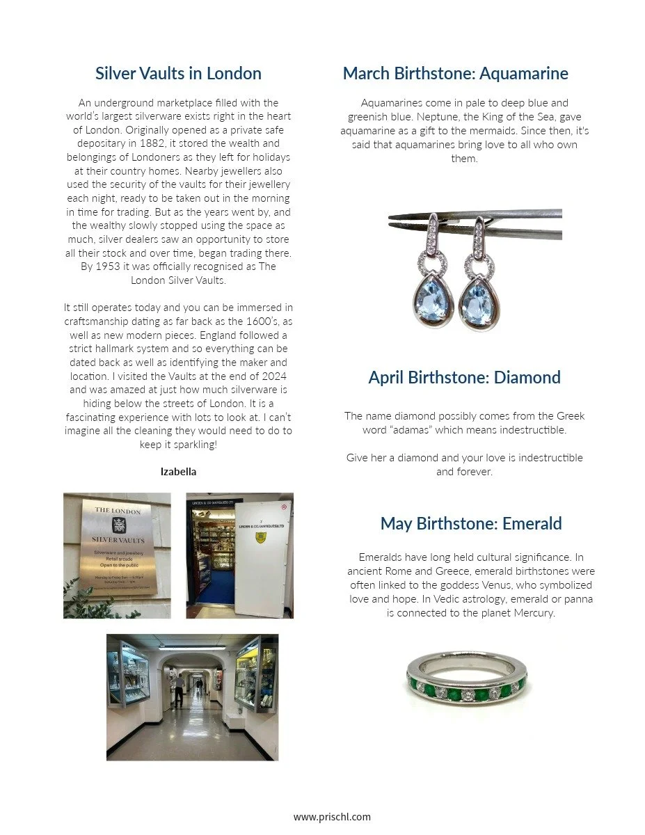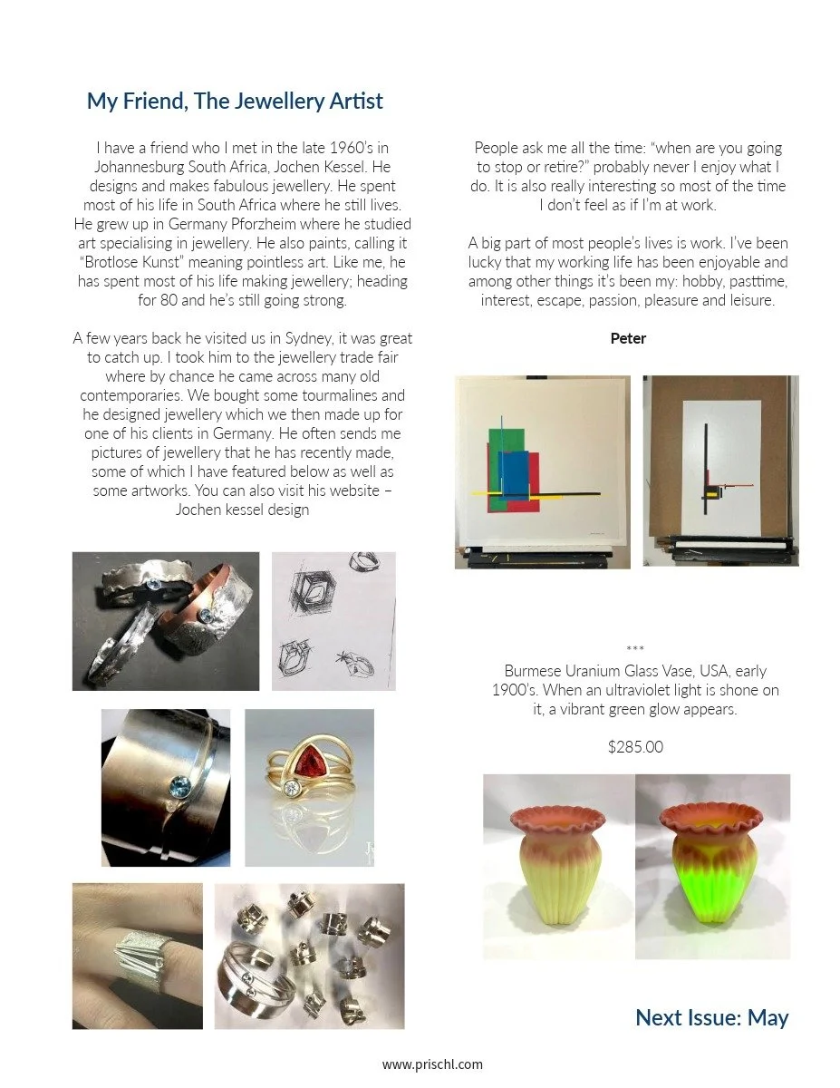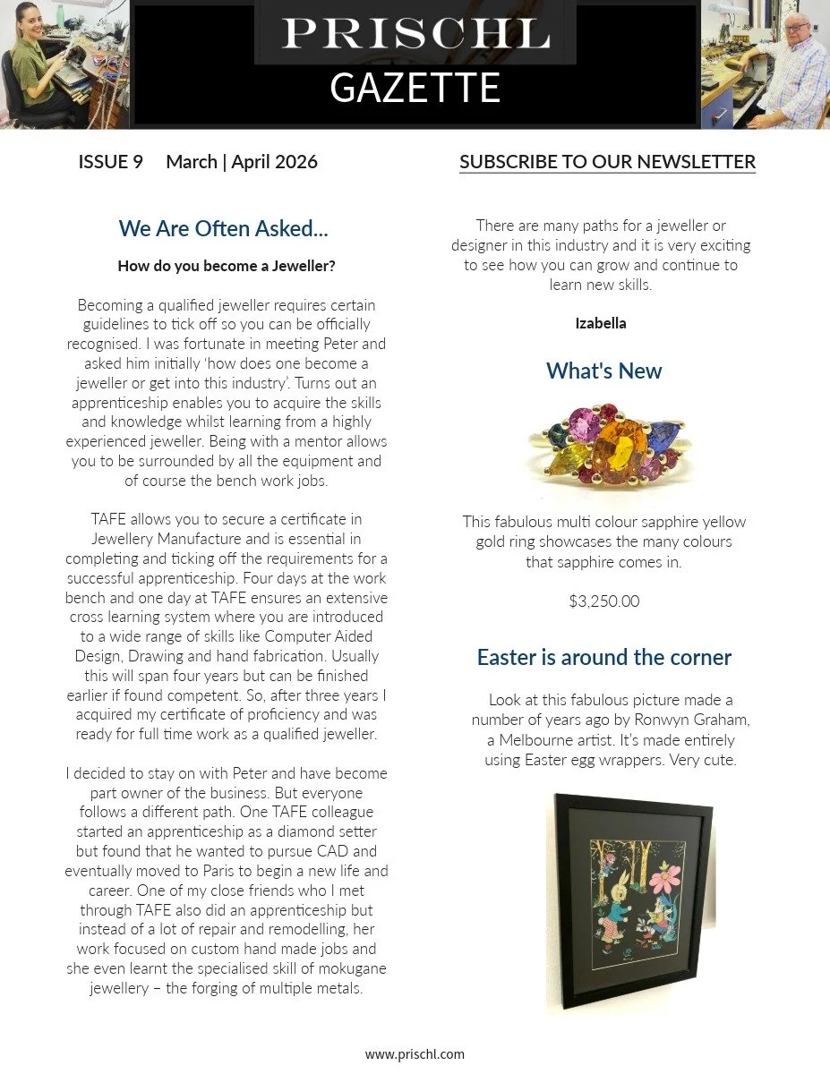 Welcome to our latest newsletter. This month, Izabella answers your questions about how to become a jeweller and visits the incredible Silver Vaults in London, Peter introduces the artist and jeweller Jochen Kessel, and we showcase a stunning new ring design in multicoloured sapphires. We also have some wonderful antiques & vintage jewels, and our birthstone for March and April - Aquamarine & Diamond!